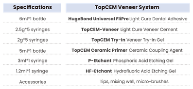 TopCEM-Veneer Light Cure Veneer Cement, the core of this solution, is used for permanent cementation of veneers made from materials of porcelain /ceramic and composites, meeting diverse needs with simplified workflow and impressive natural aesthetic results.